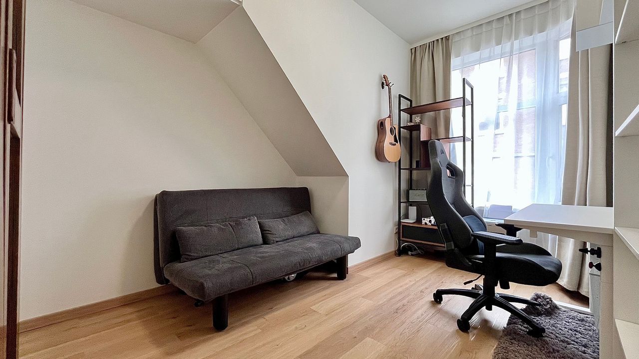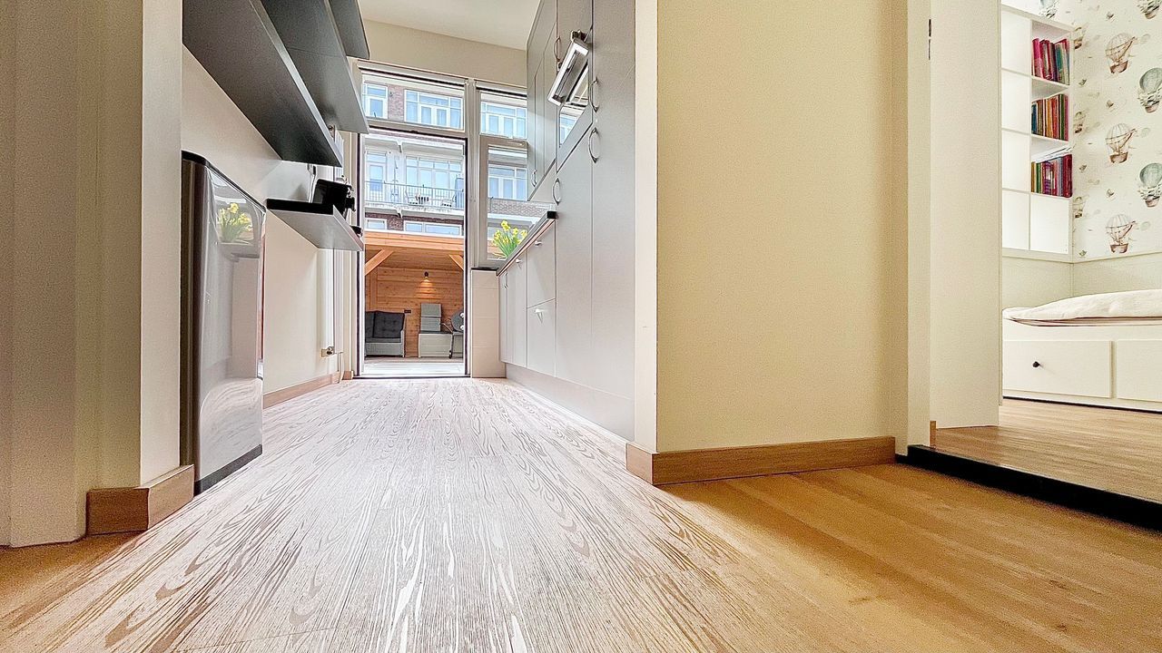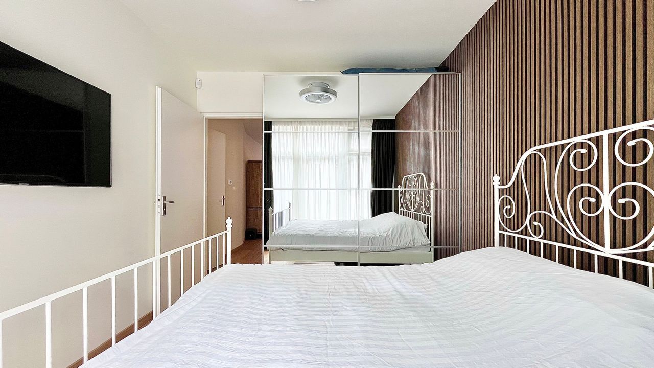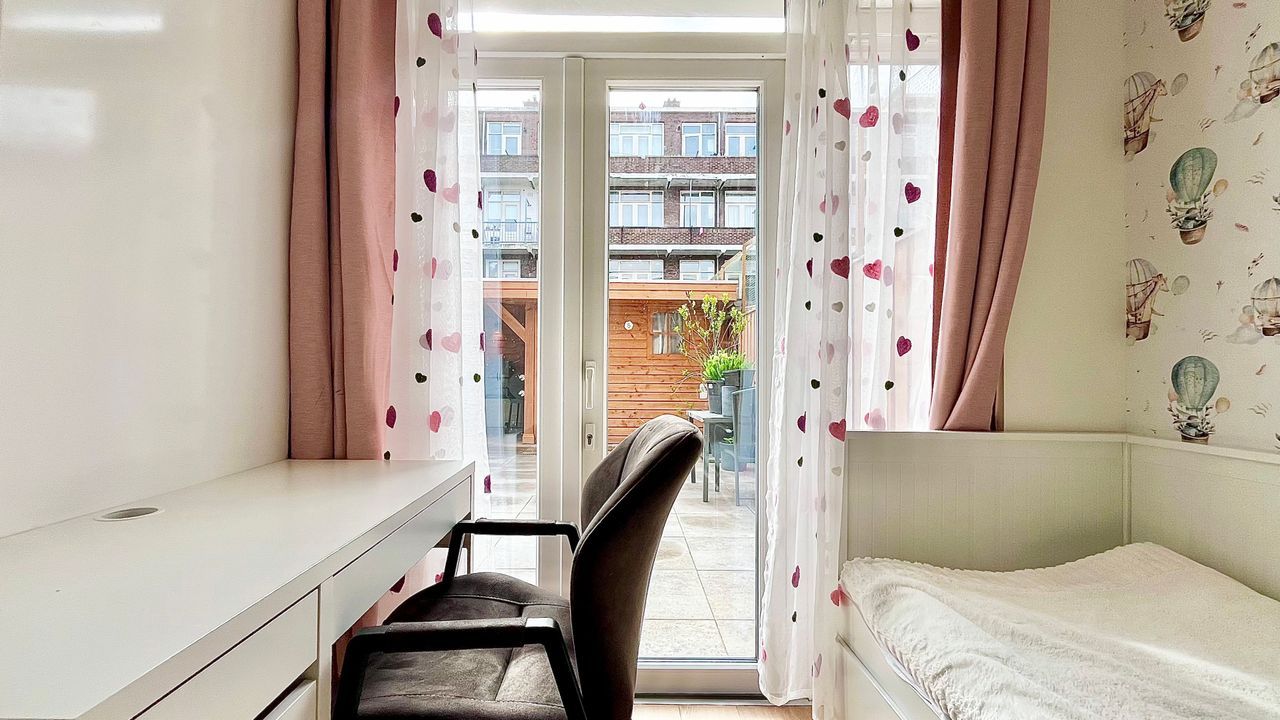 De tweede slaapkamer is gelegen aan de voorzijde (voorzijkamer) van totaal 4.08 meter bij 2,78 meter. Aan de voorzijde ook veel ramen en speels zijraam. Dan kastruimte, met hierin de wasmachine en meterkast.