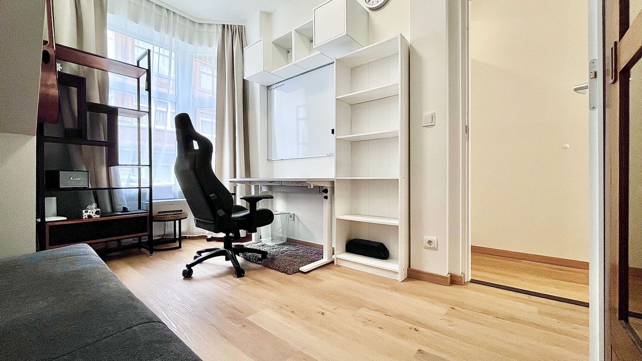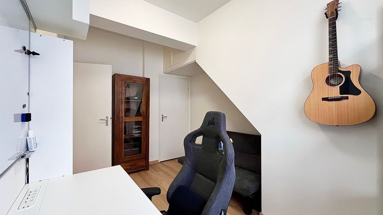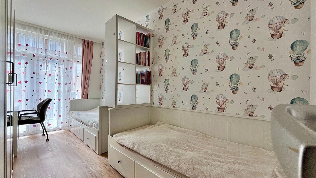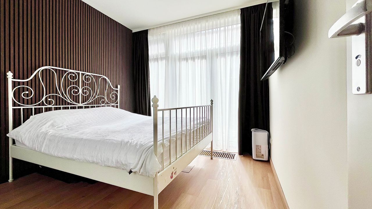 De tweede slaapkamer is gelegen aan de voorzijde (voorzijkamer) van totaal 4.08 meter bij 2,78 meter. Aan de voorzijde ook veel ramen en speels zijraam. Dan kastruimte, met hierin de wasmachine en meterkast.
