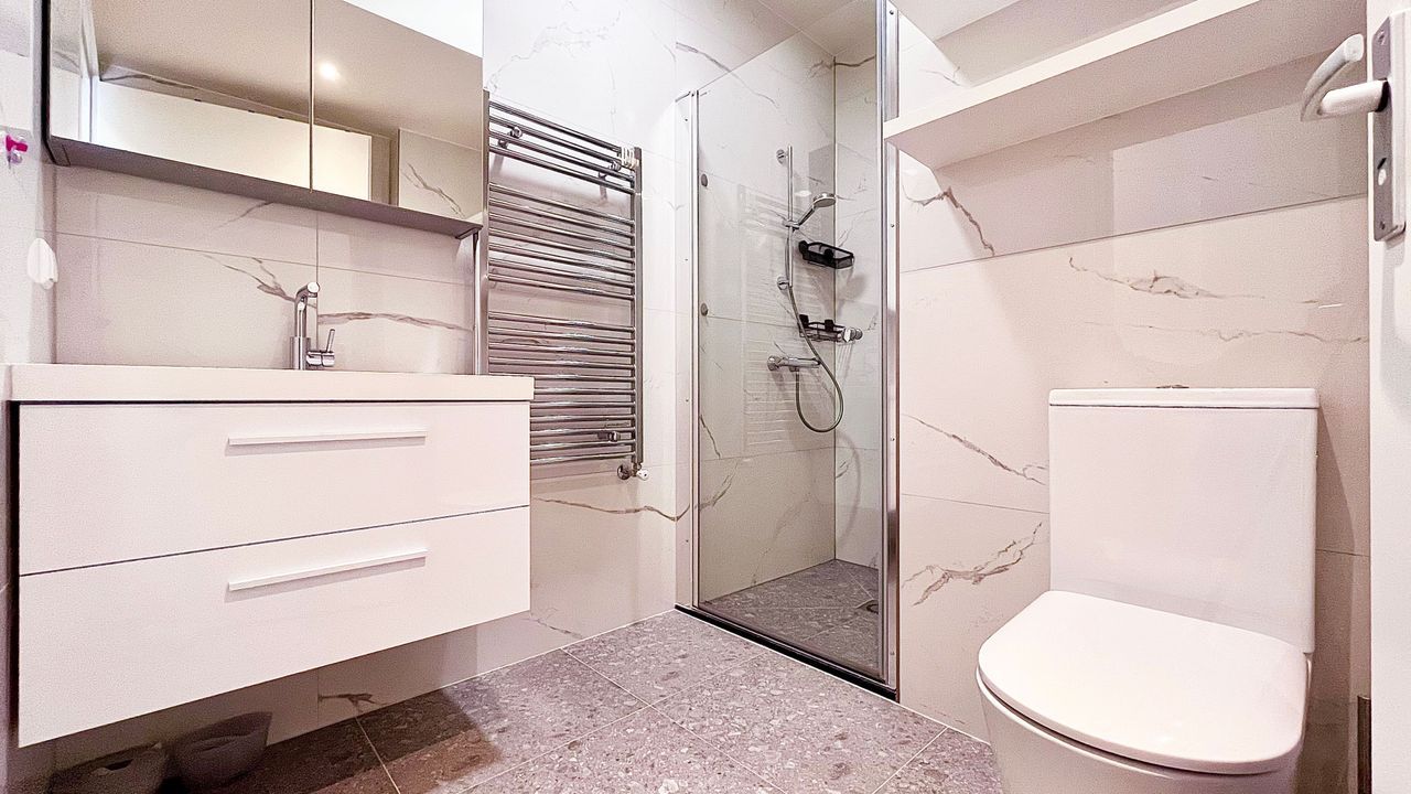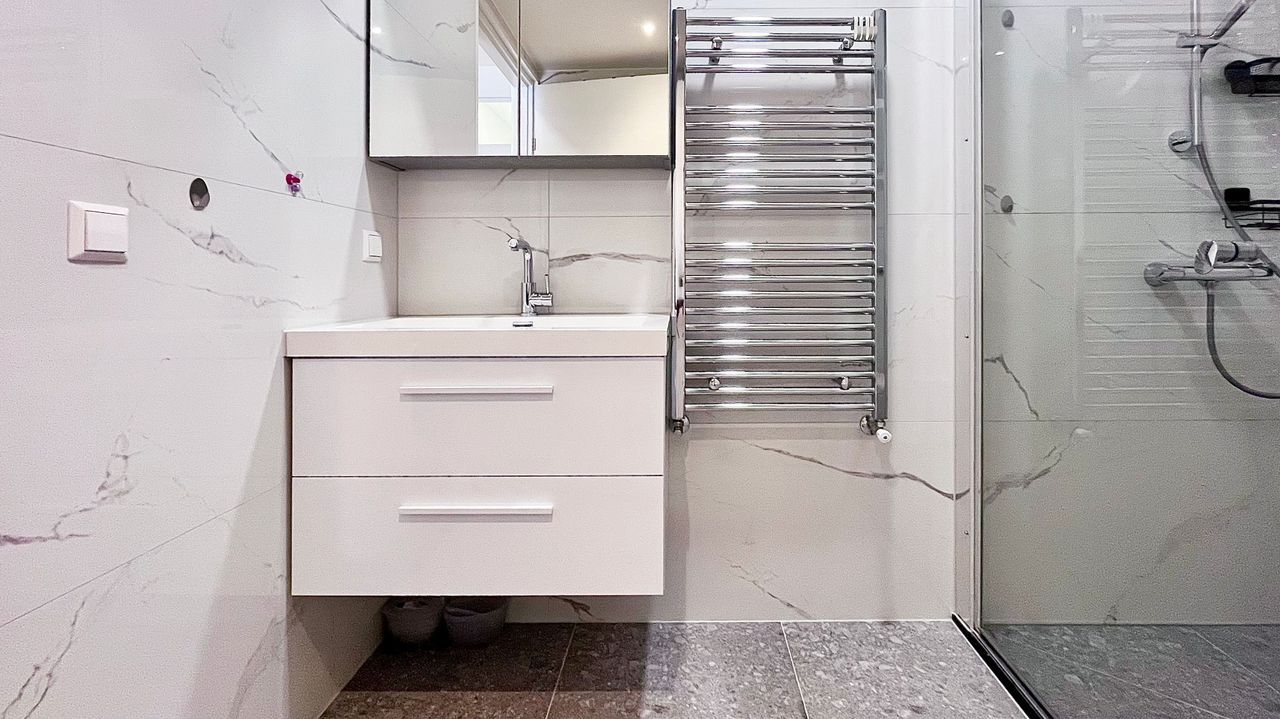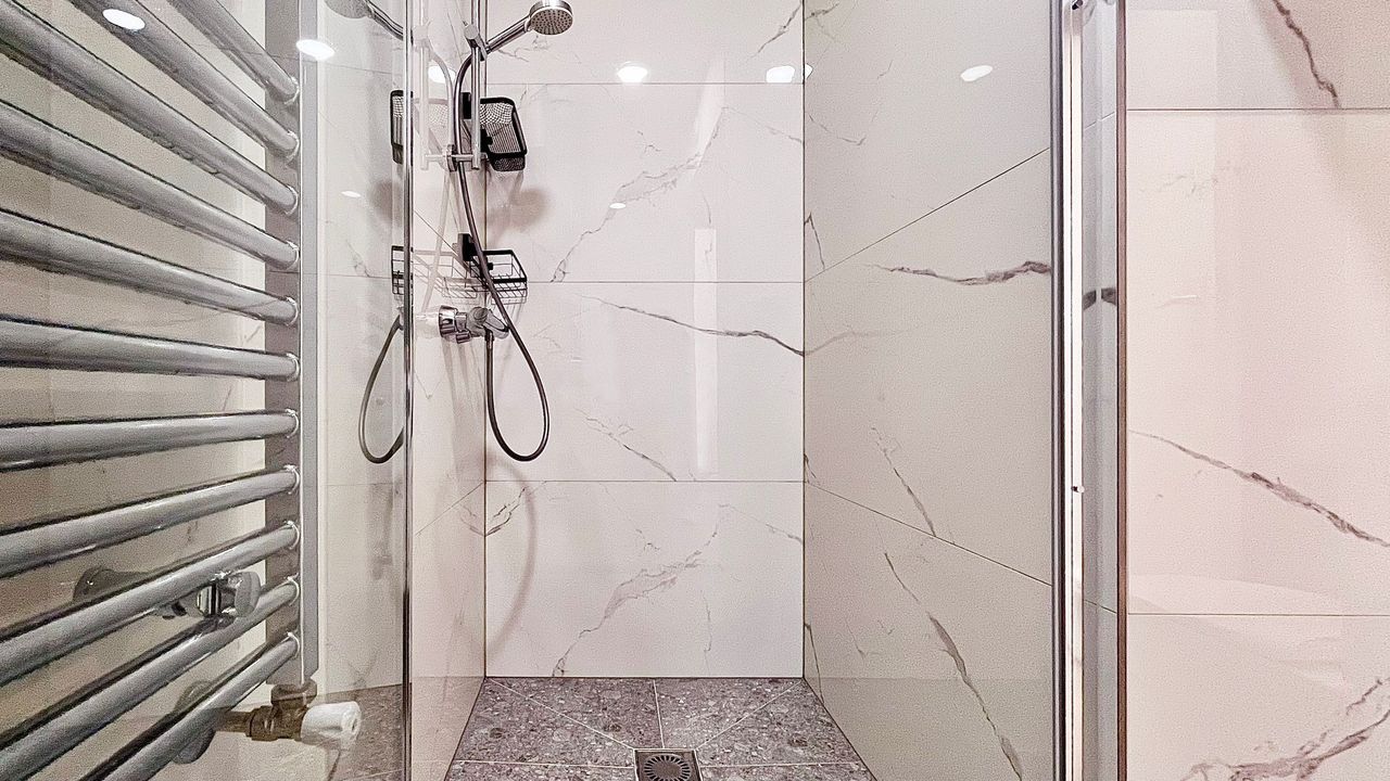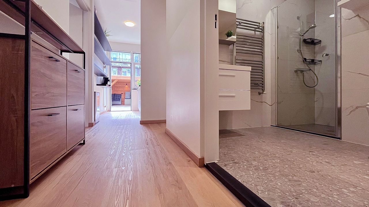 From the hallway, you reach the neatly finished bathroom in light tones, equipped with a walk-in shower, washbasin, and toilet.