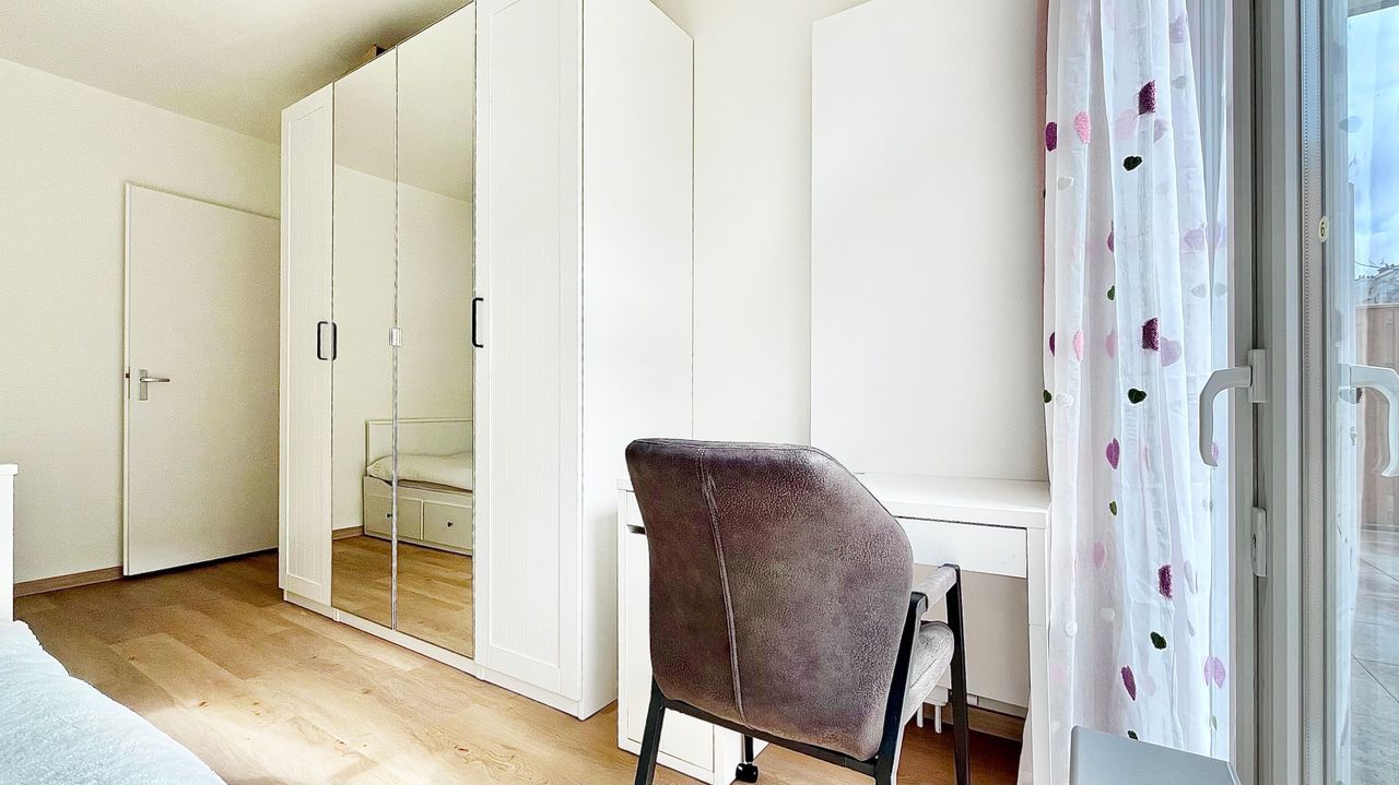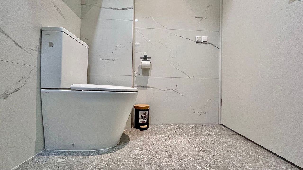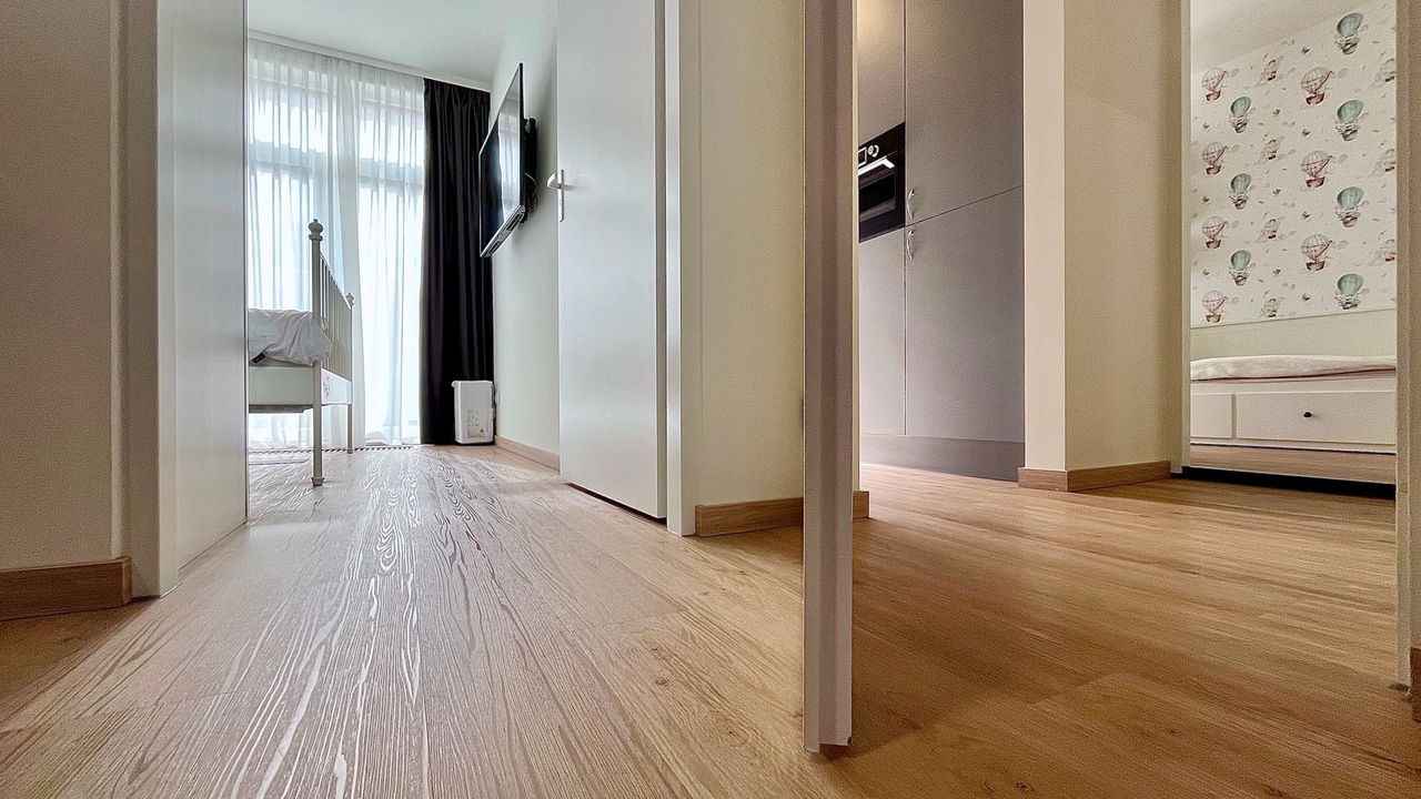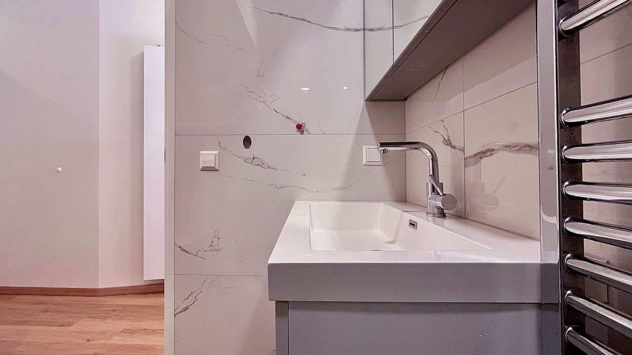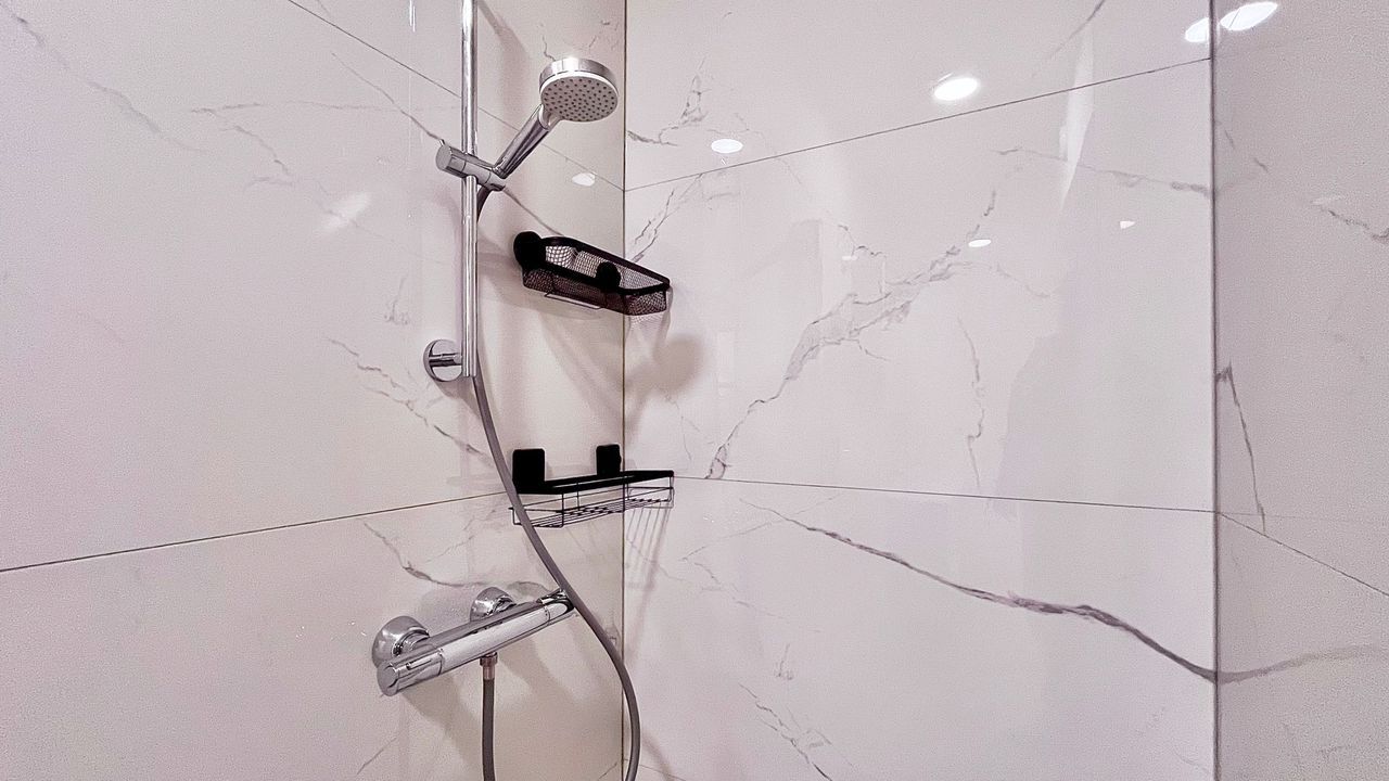 From the hallway, you reach the neatly finished bathroom in light tones, equipped with a walk-in shower, washbasin, and toilet.