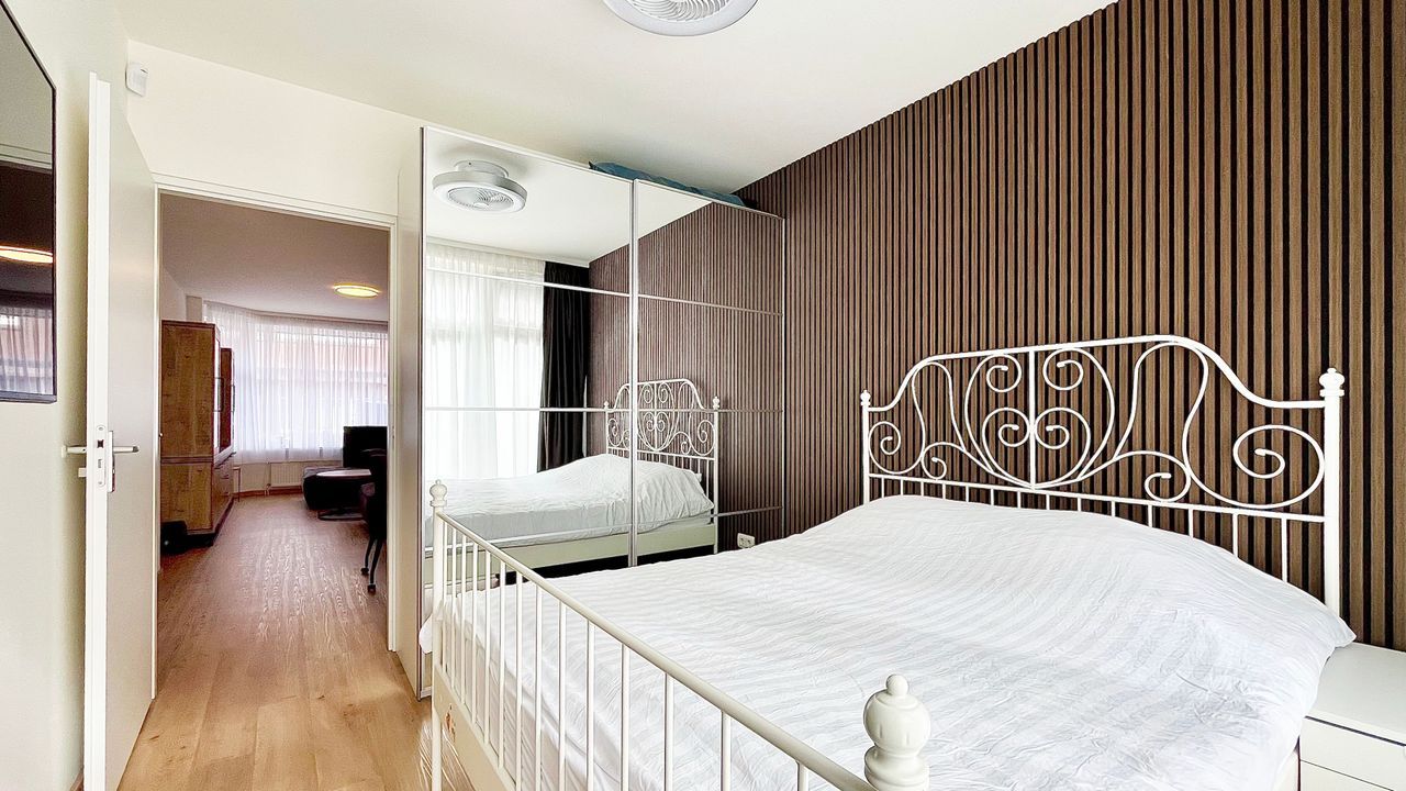 De eerste slaapkamer (grootste) ligt hierachter en meet 3,46 meter bij 3,20 meter. Hier openslaande deuren naar de achtertuin.