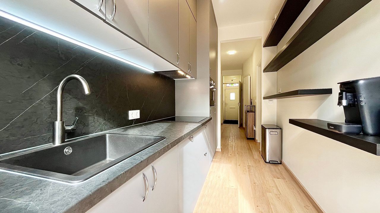 The contemporary, well-maintained closed kitchen is located towards the rear and is fitted with a range of built-in appliances, including an induction hob, all in excellent condition. Direct access to the garden is provided.