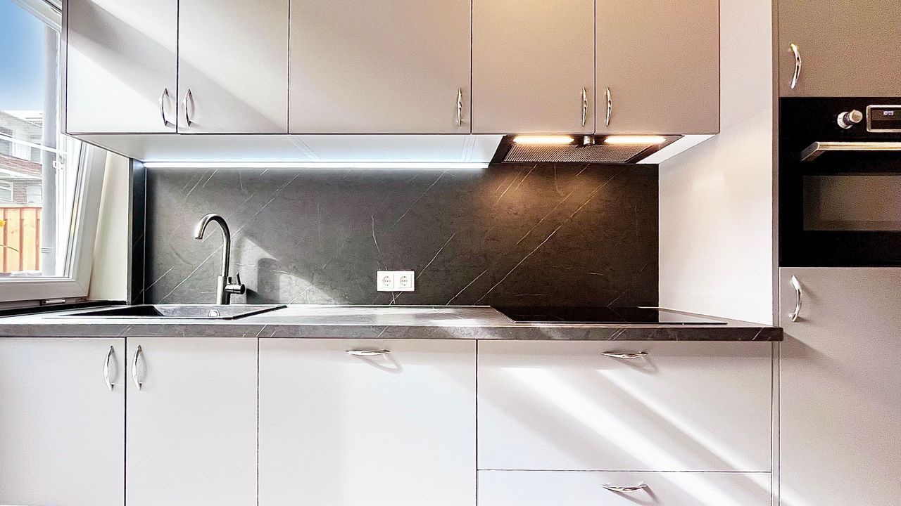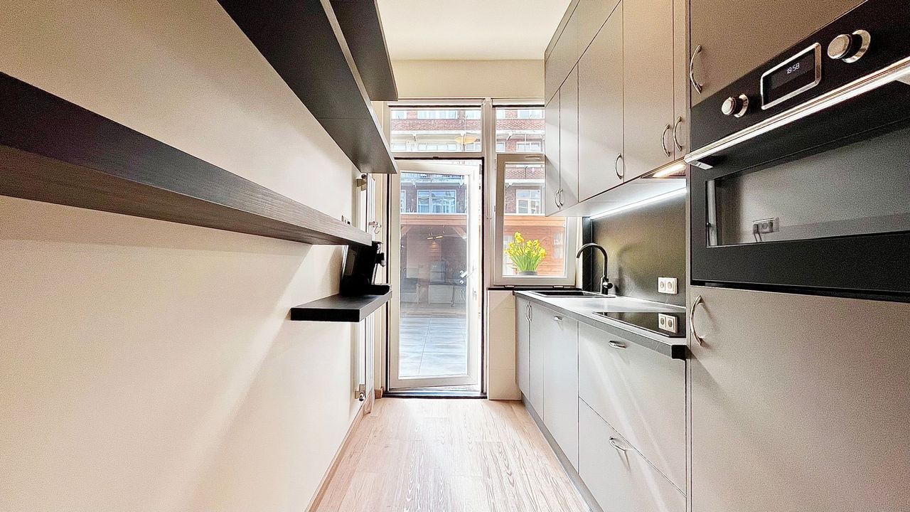 De hedendaagse en verzorgde, dichte keuken ligt mid-achter en is voorzien van allerlei inbouwapparatuur, waaronder een inductie kookplaat. Alles in uitstekende staat. Deur naar de achtertuin.