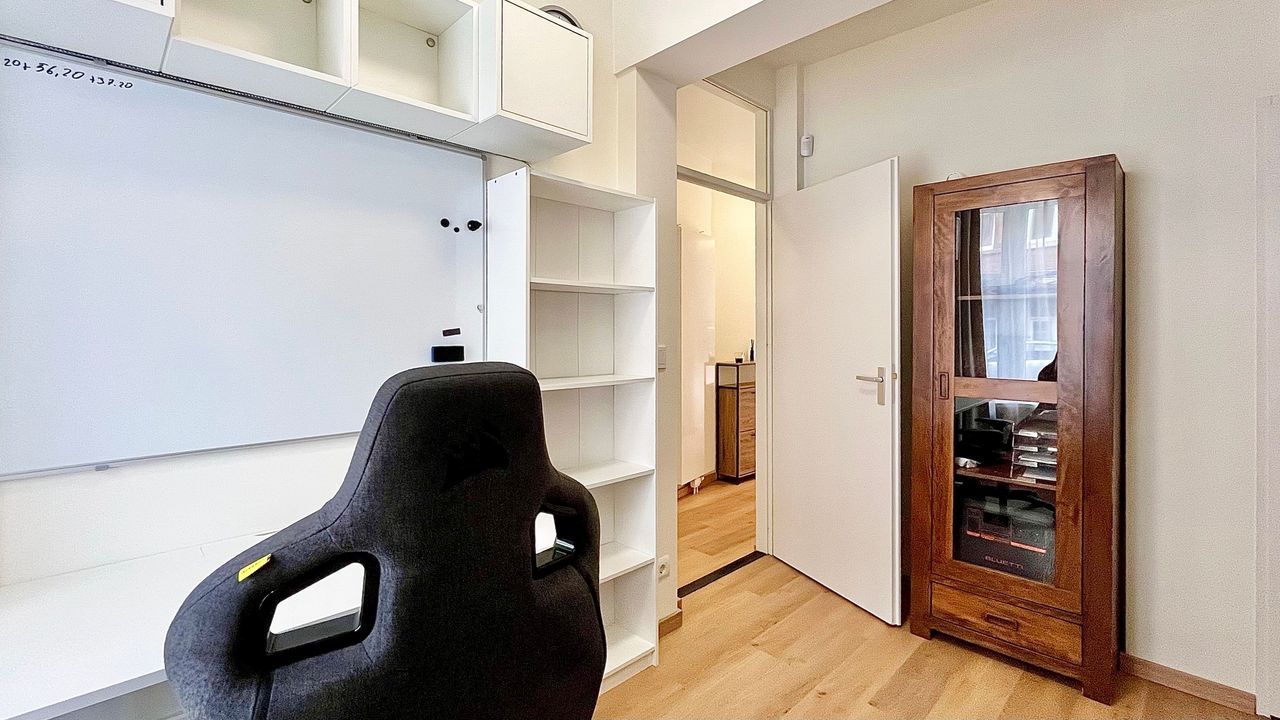 The well-kept, tiled rear garden enjoys a sunny southeast orientation. A wide awning spans the rear façade, offering the choice between sun and shade, as well as a comfortable covered seating area (approx. 4.70 m x 2.61 m) overlooking the rear elevation. Additionally, there is a separate storage unit (approx. 2.84 m x 2.64 m), ideal for bicycles, equipment, or hobbies, equipped with electricity and water supply.