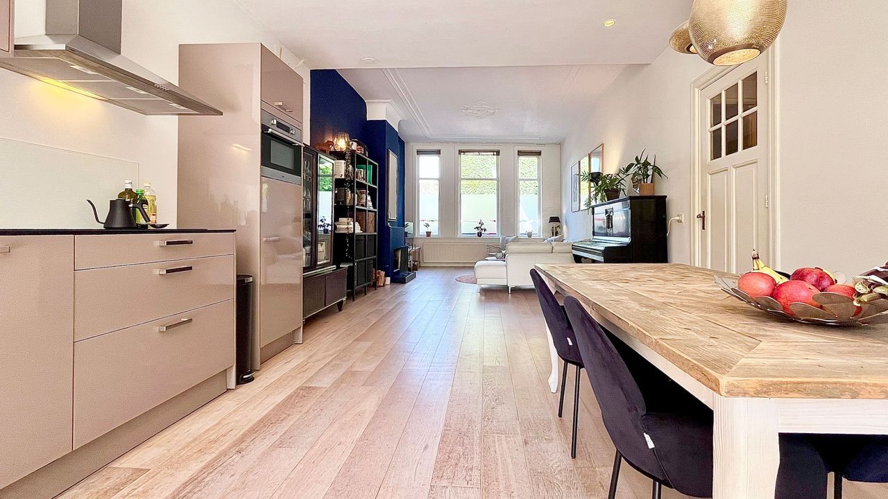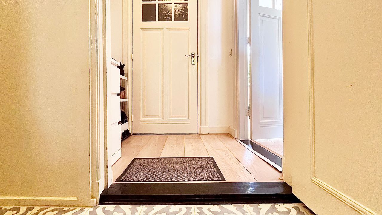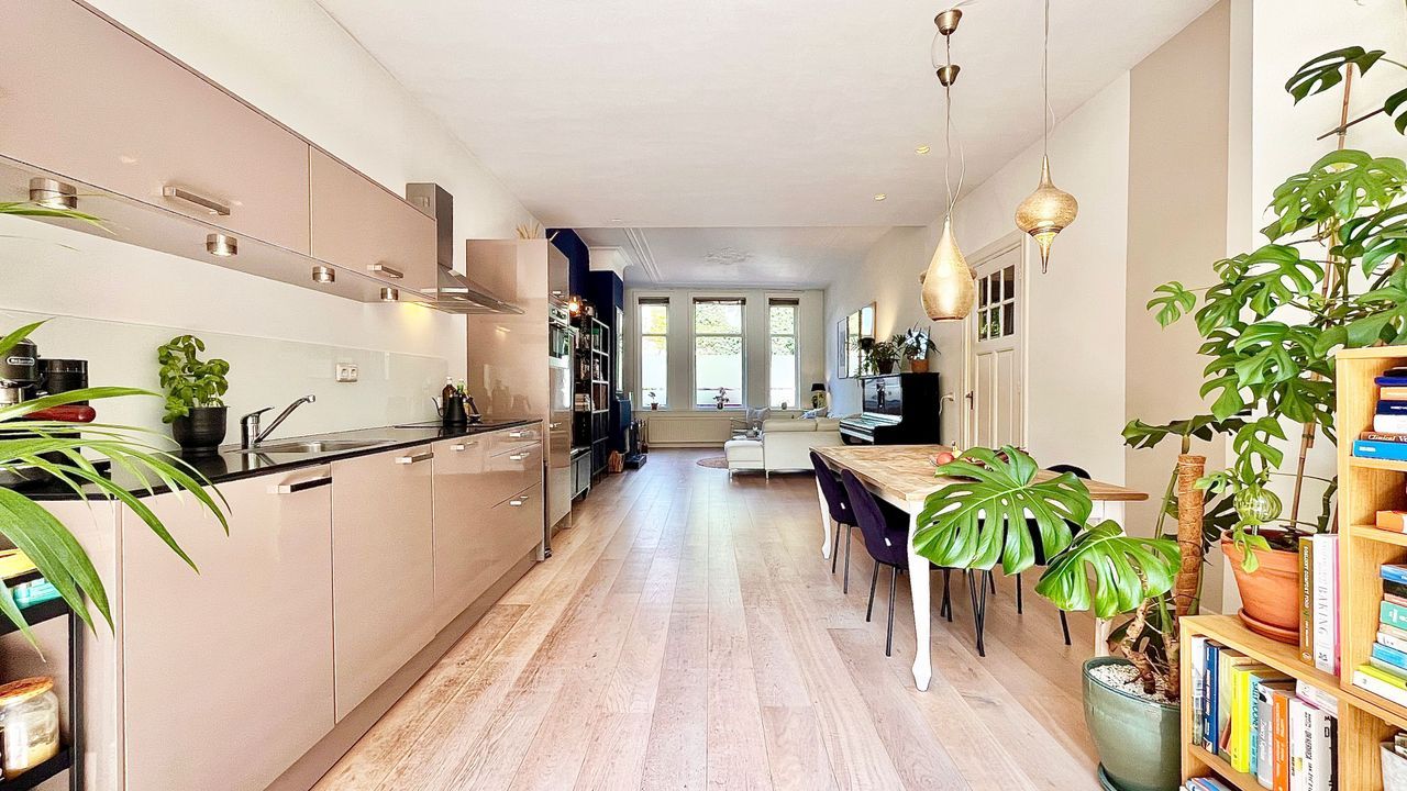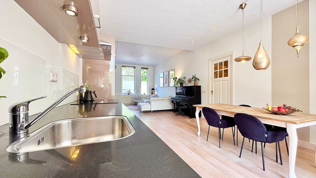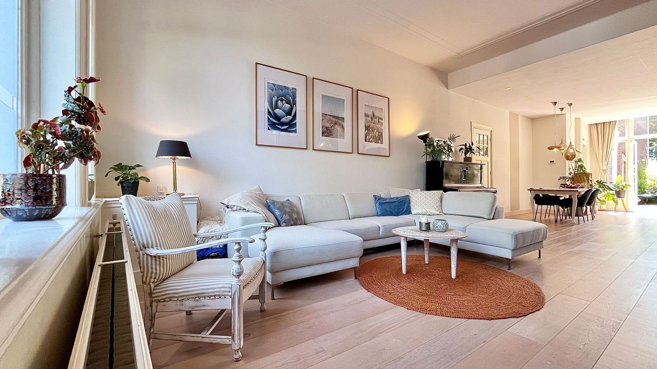 Indeling; voordeur, entree gedeeld met de buren van het separaat goed afgesplitste achterhuis. Gang met mooie tegelvloer. Eigen afgesloten entree, plek voor garderobe en apart modern toilet met fontein. Deur naar de riante en zalige woonkamer met zitgedeelte aan de voorzijde, open haard en doorloop naar de open keuken met eetgedeelte.