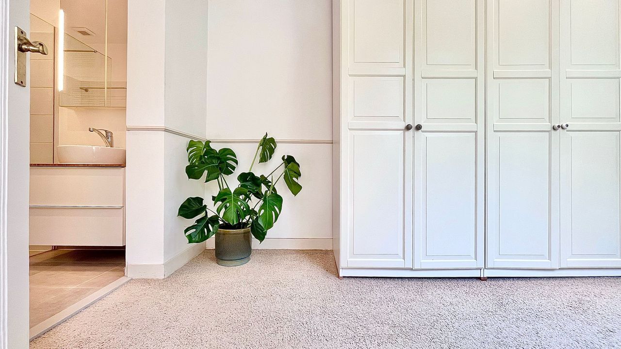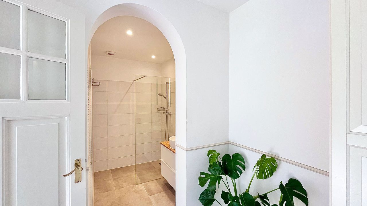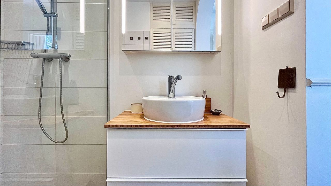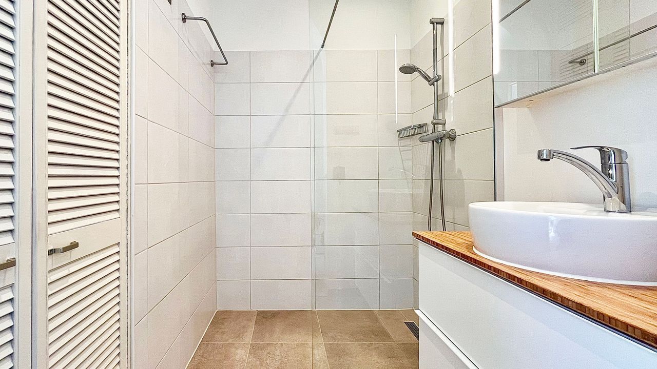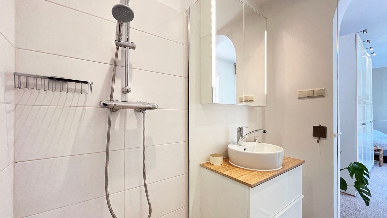Through the bedroom, you access the modern bathroom, with a washer neatly tucked away in a built-in cabinet, as well as the central heating combi-boiler (Remeha). The bathroom features a walk-in shower and a modern vanity unit.