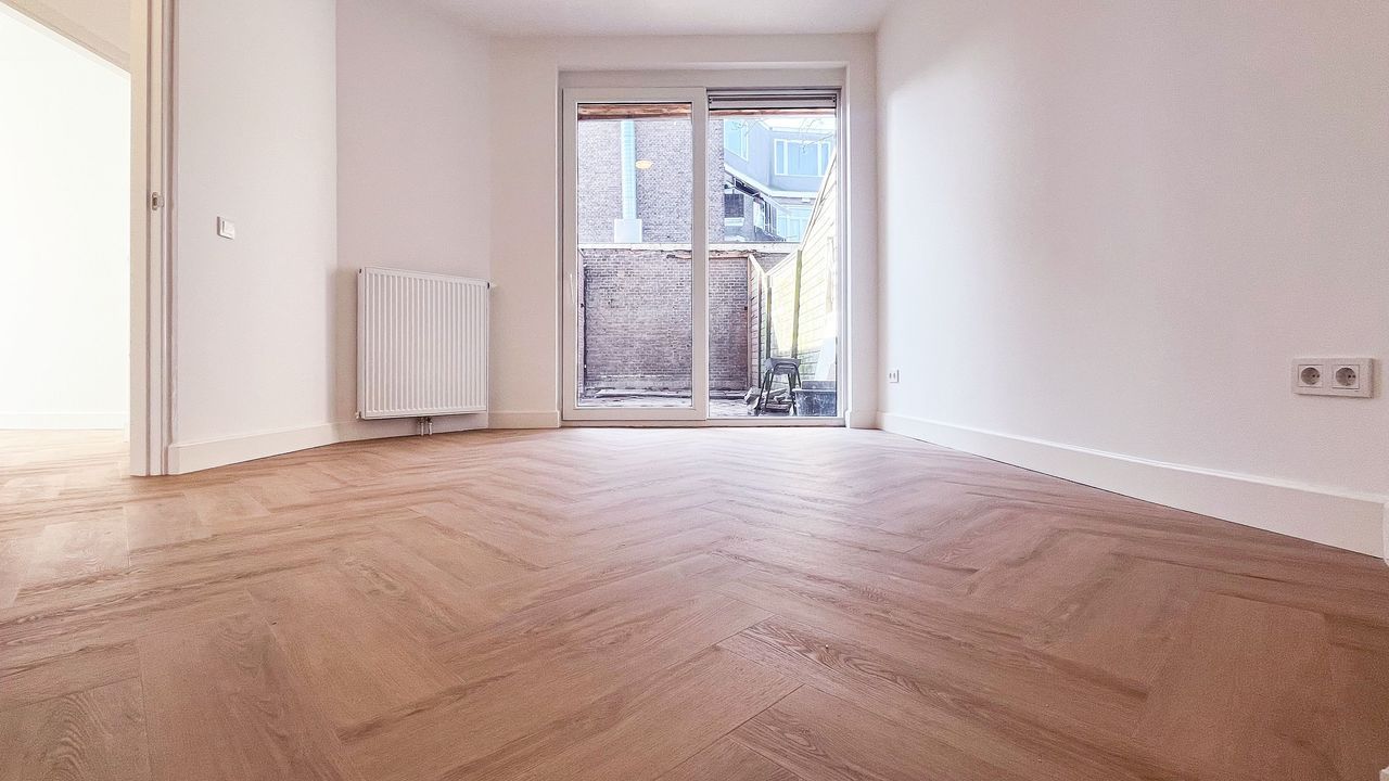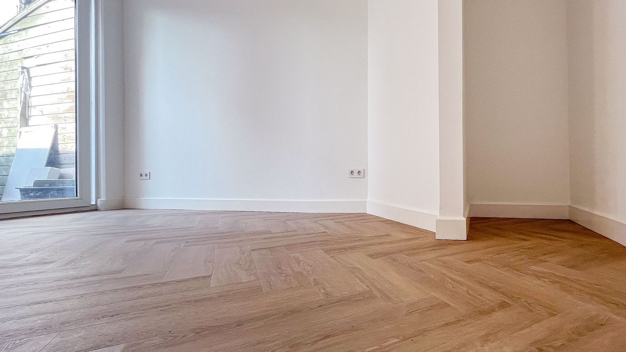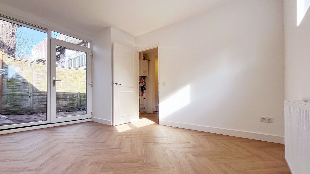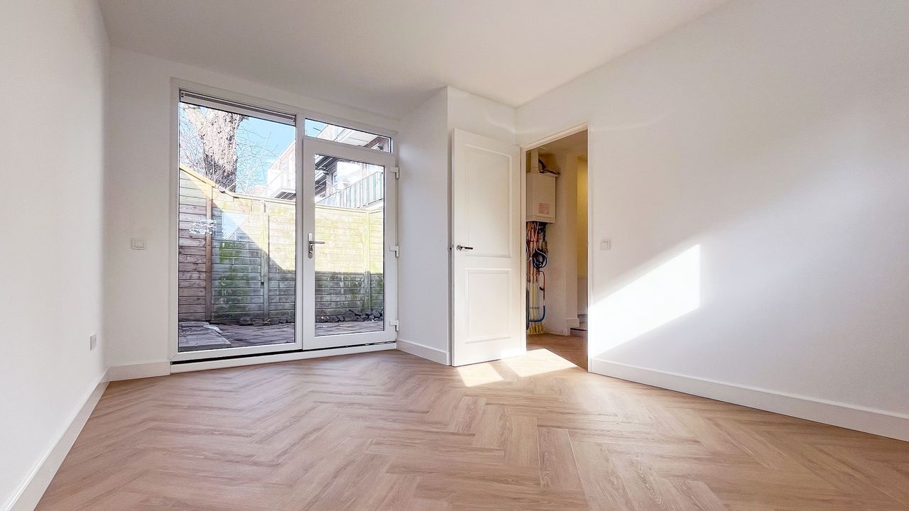Dan de eerste slaapkamer met nieuwe (betonnen) vloer en pui naar de achtertuin. Deze kamer is 4,29 meter bij 3,26. En aan de voorzijde hoge ramen.