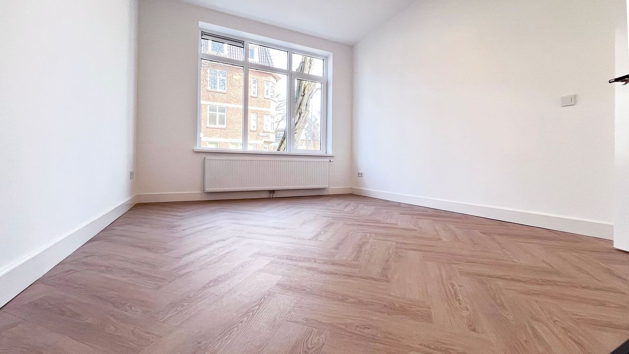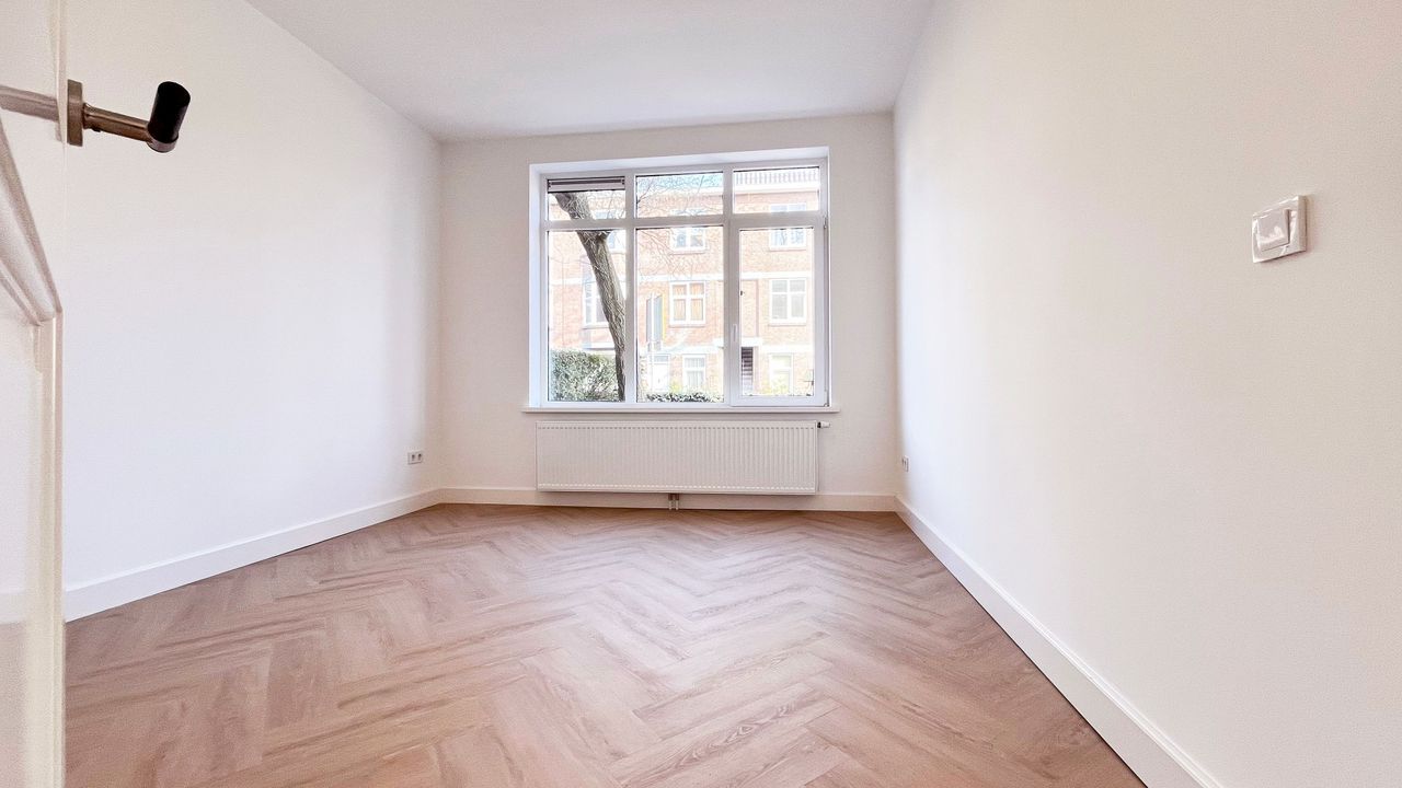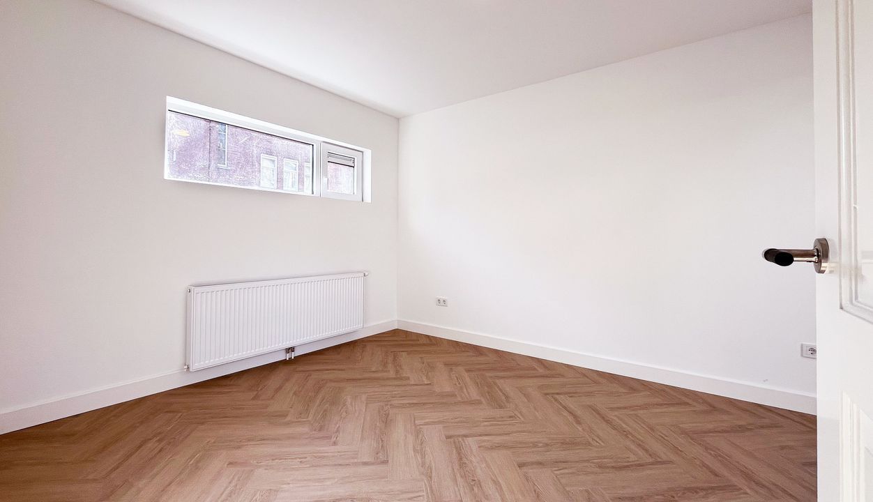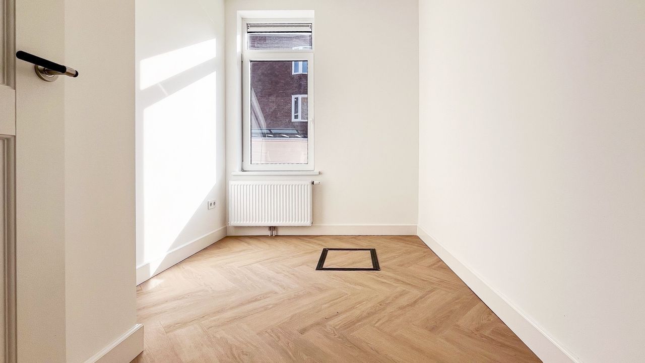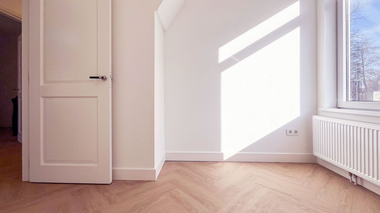 Dan de eerste slaapkamer met nieuwe (betonnen) vloer en pui naar de achtertuin. Deze kamer is 4,29 meter bij 3,26. En aan de voorzijde hoge ramen.