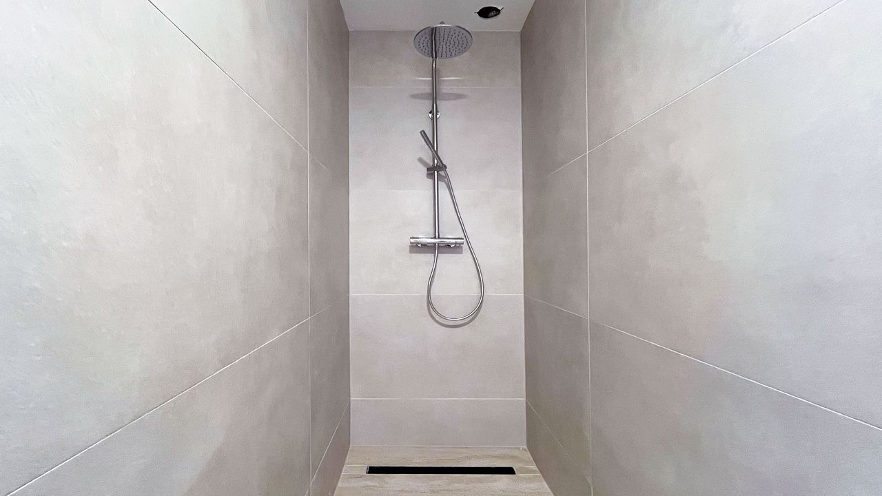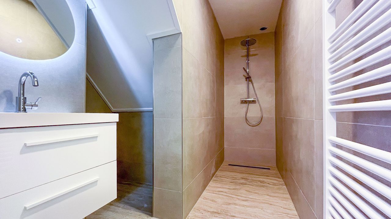 Lange gang naar eerst de nieuwe fraaie badkamer met riante inloopdouche, vaste wastafel, ronde spiegel met verlichting en bergruimte. Handdoekradiator.