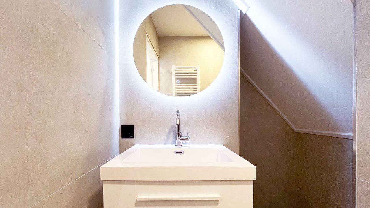 A stylish new bathroom with generous walk-in shower, fixed washbasin, illuminated round mirror, storage space and towel radiator.