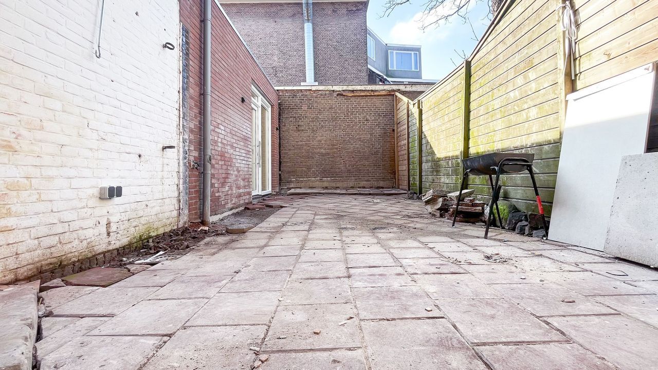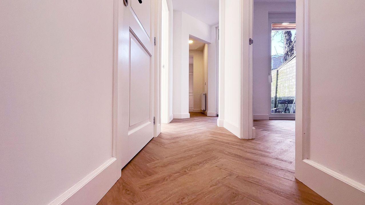 Meterkast. Deur naar de achtertuin van 7,50 meter diep en 3,60 breed. Slaapkamer twee is de kleinste van allemaal (de voormalige keuken) van 3.07 meter bij 2,24. Apart (nieuw) vrijhangend toilet met fonteintje.