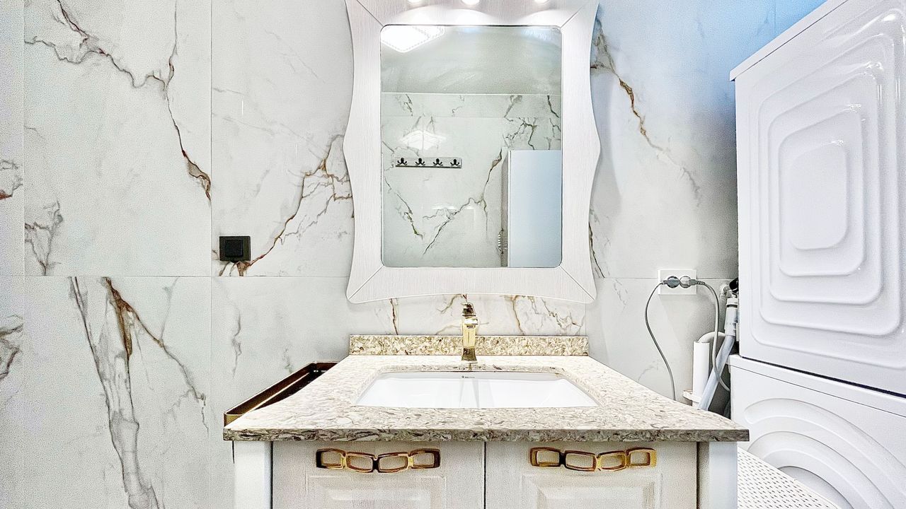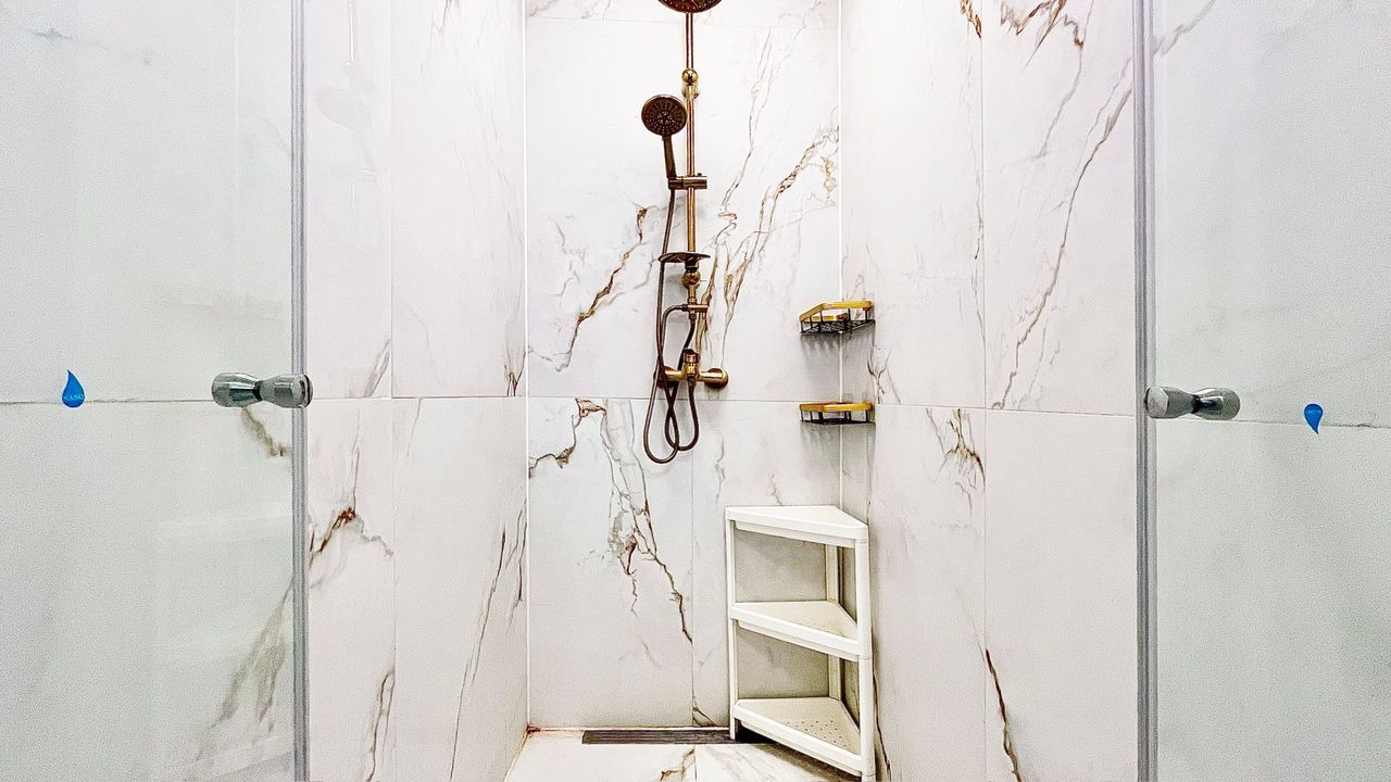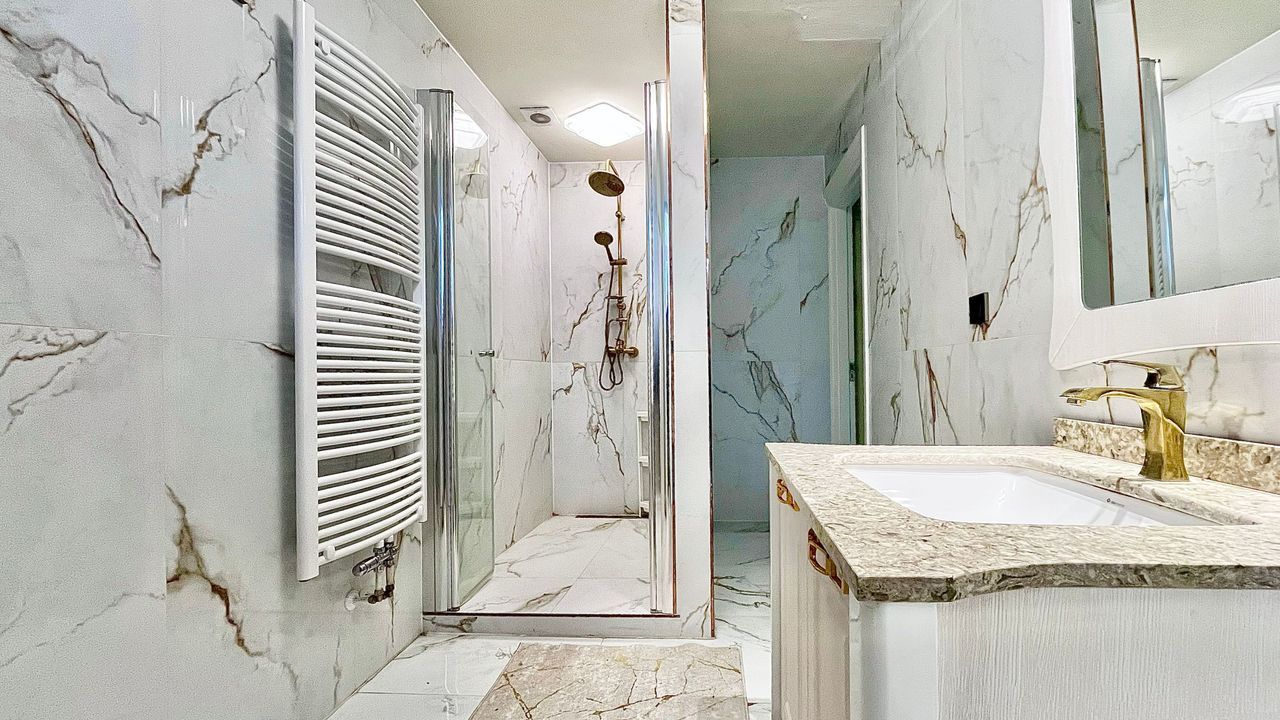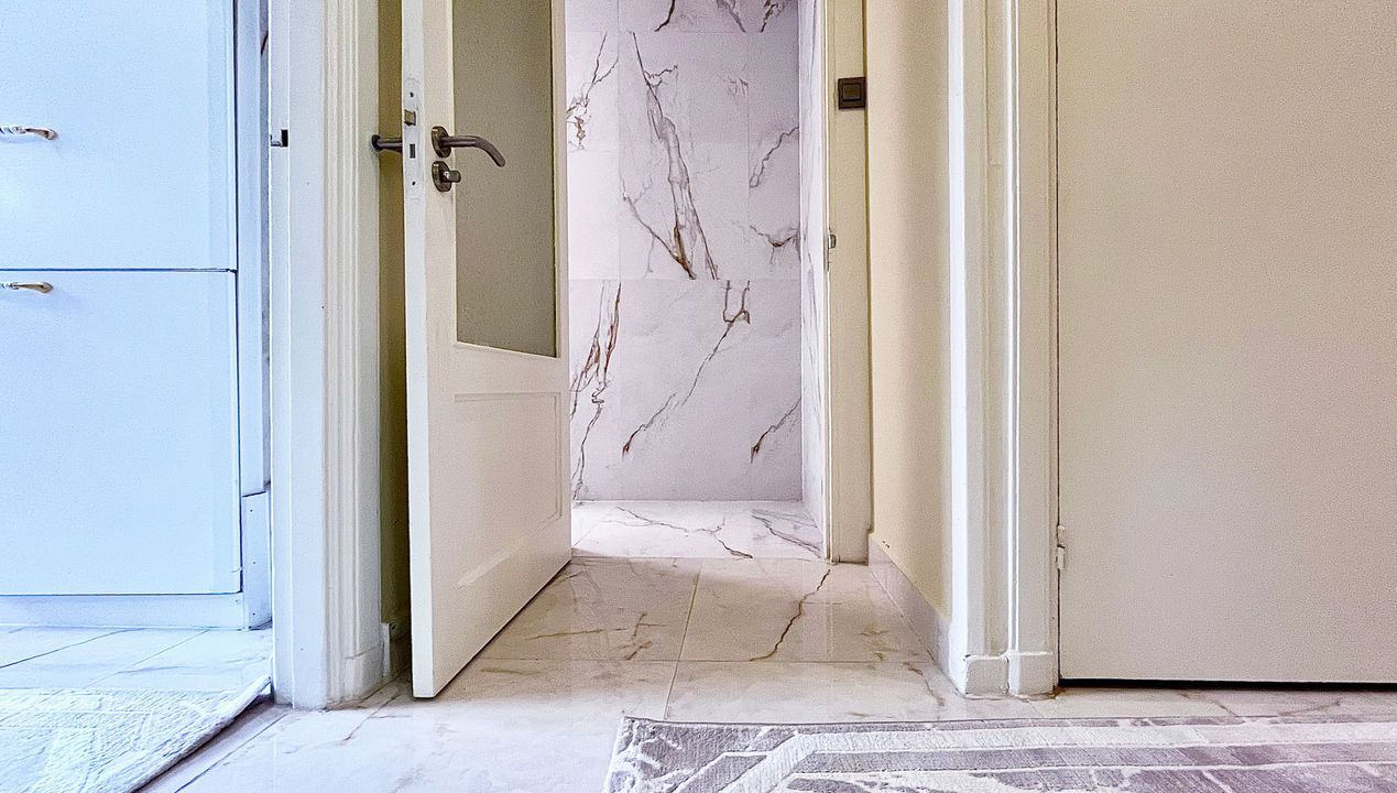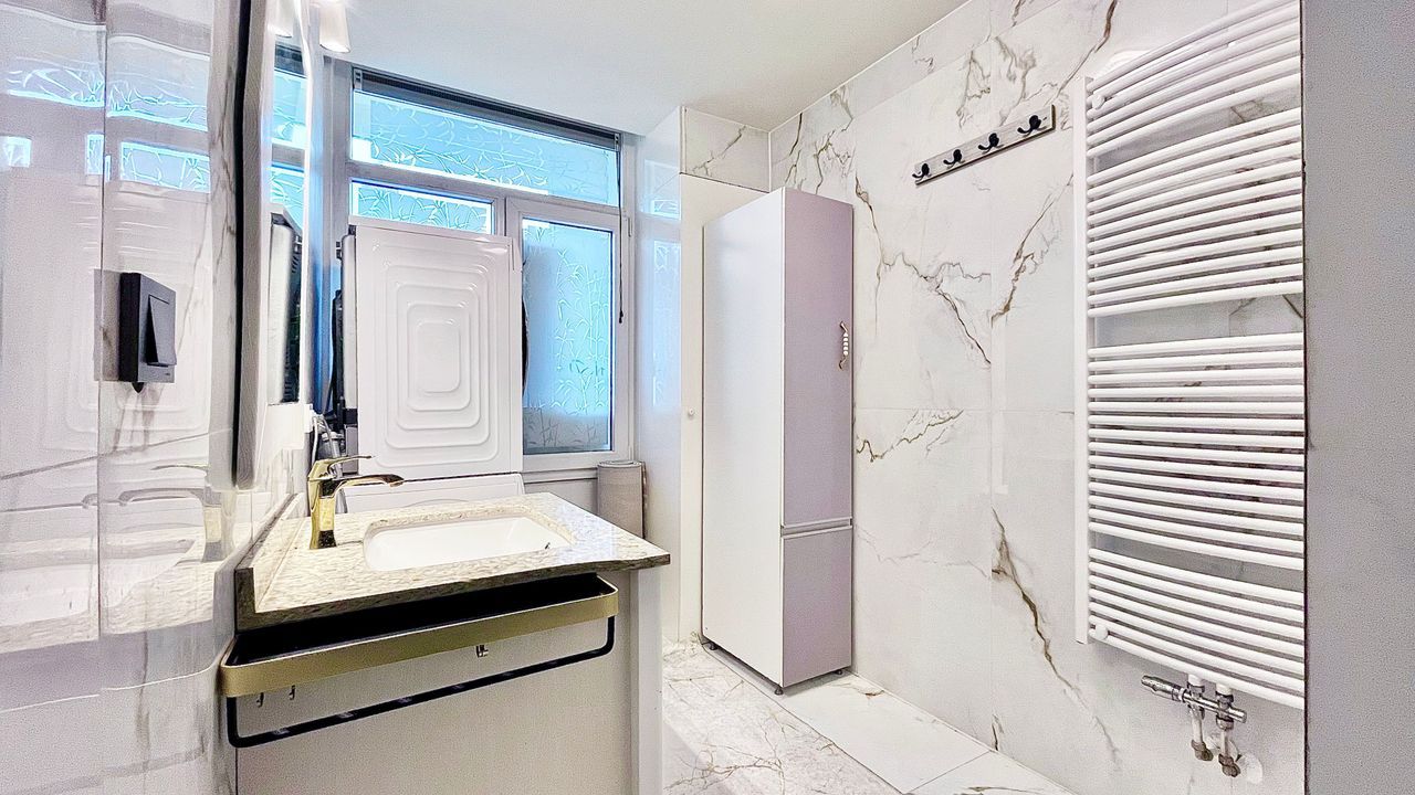 The former rear-side room has been transformed into a well-proportioned bathroom (approx. 4.15 x 1.86 metres), fitted with a walk-in shower, fixed washbasin, designated space for a washer and dryer, and the installation of a central heating combi-boiler.