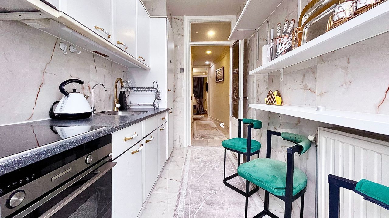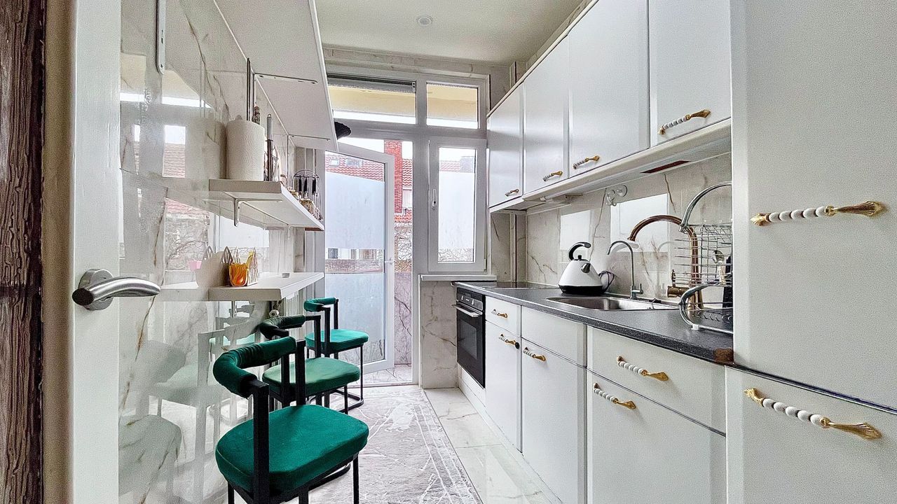 The enclosed kitchen is situated at the mid-rear of the property, featuring a straight-line configuration and direct access to the generously sized rear balcony of nearly 7 metres in length and 0.85 metres in width.