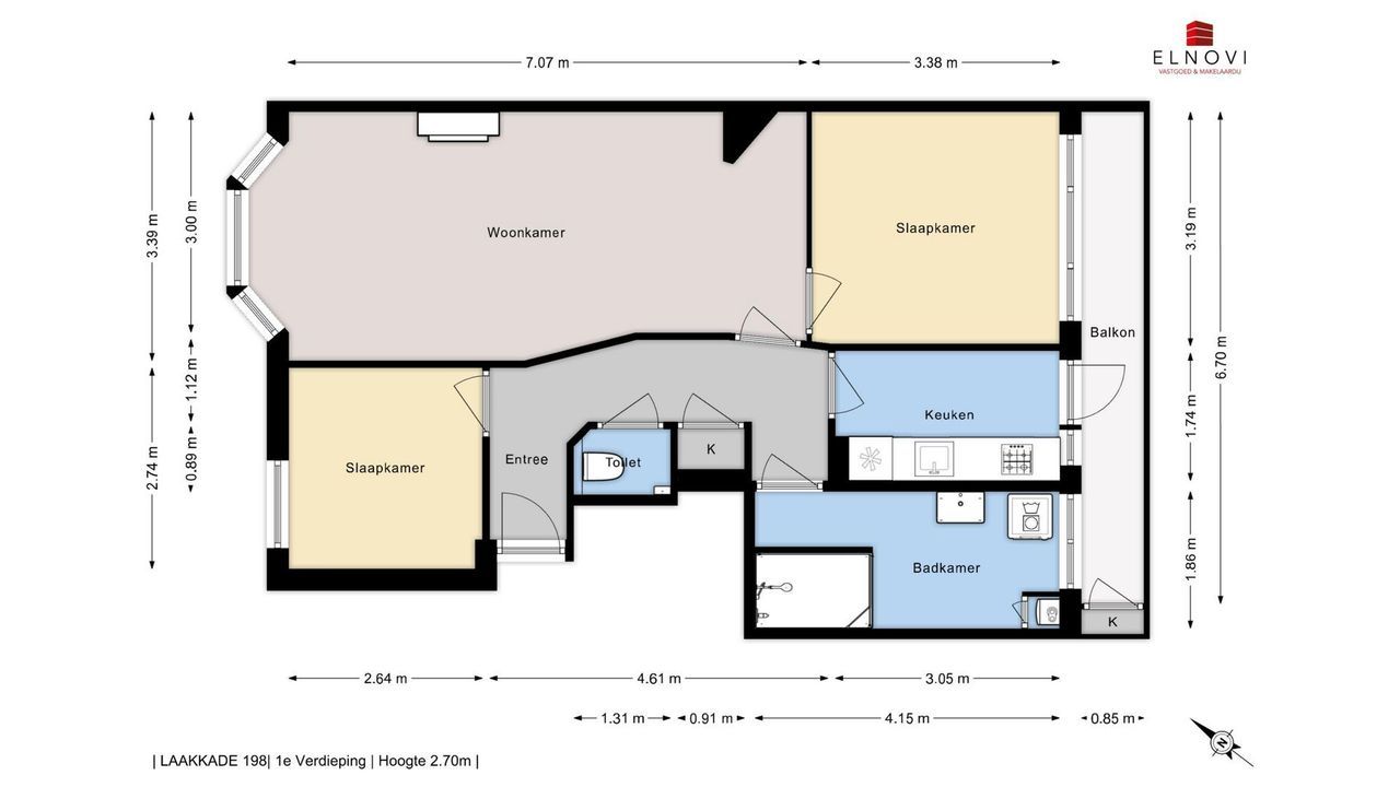 Aan de mid-achterzijde ligt de dichte keuken, rechte opstelling en met deur naar het brede achtergelegen balkon van bijna 7 meter bij 0,85 meter.