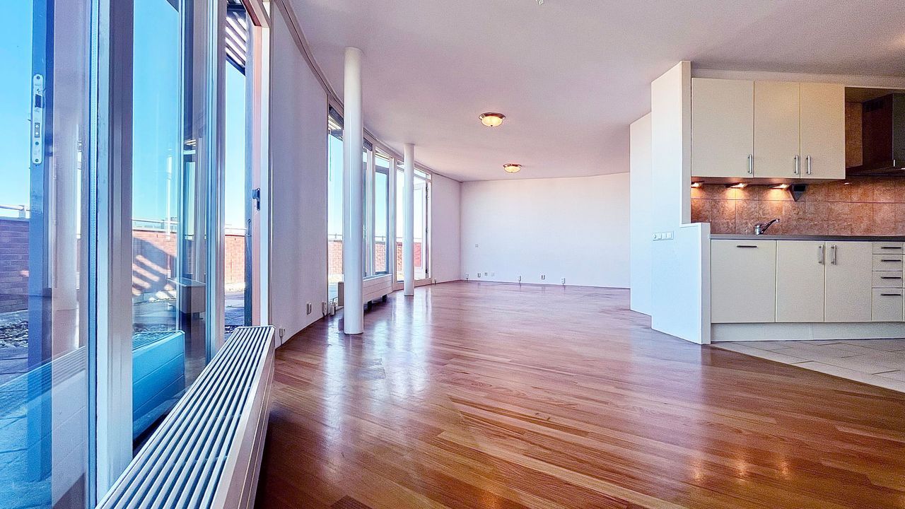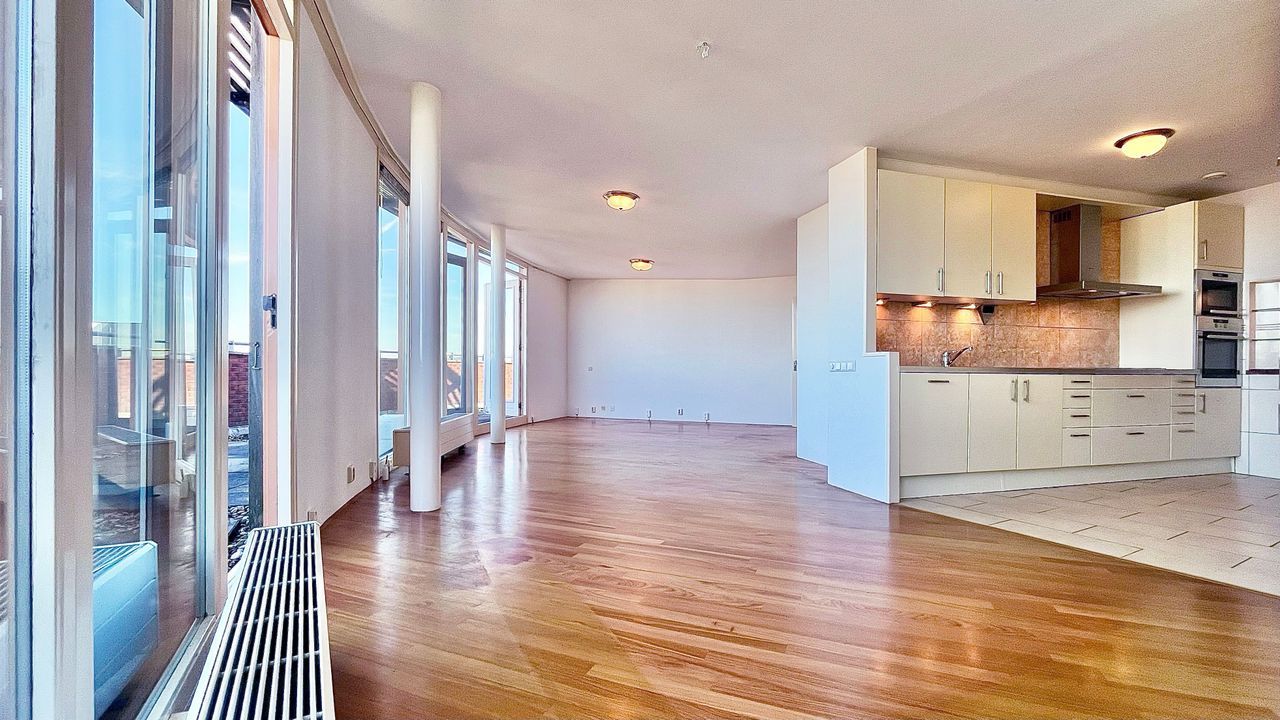 Through two elegant glass double doors, you enter the spectacular living room. Measuring up to 11.5 metres wide and 7 metres deep, this space is truly grand. Large windows and multiple doors lead out to the delightful terrace — perfect for indoor-outdoor living.