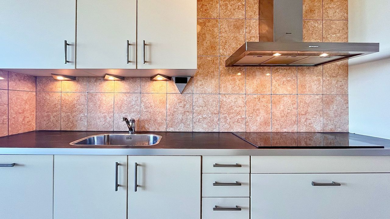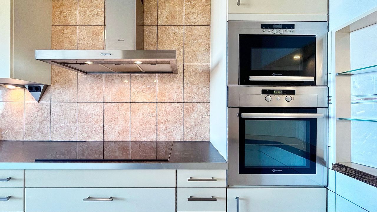 Moderne open keuken met inbouwapparatuur, wel wat ouder, maar in goede staat.
