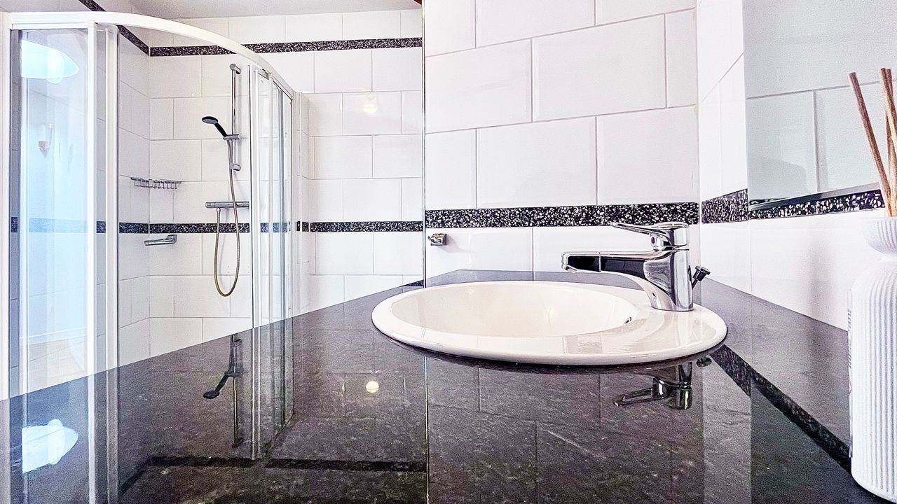 Separate moderne badkamer met wastafelmeubel, huidige aansluiting voor uw wasmachine en inloopdouche.