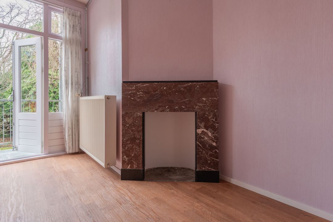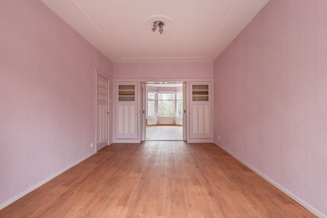 Ruime woon-/eetkamer ensuite met originele schuifseparatie en dubbele schouwen en kasten. Totale lengte ruim 12,5 meter diep en 3,5 meter breed. En een goeie hoogte van 2.80 meter. Fraaie erker met vrij uitzicht aan de voorzijde. Leuke doorkijk naar o.a. water.