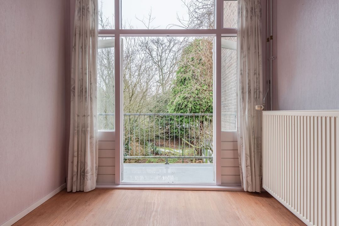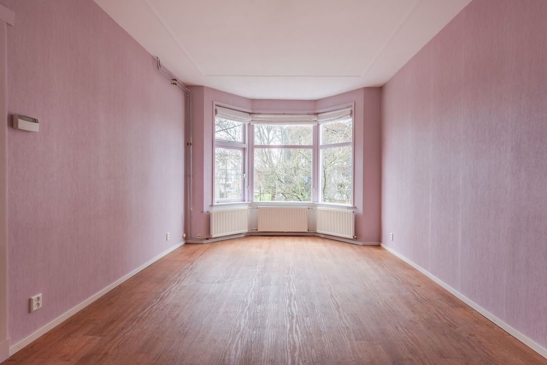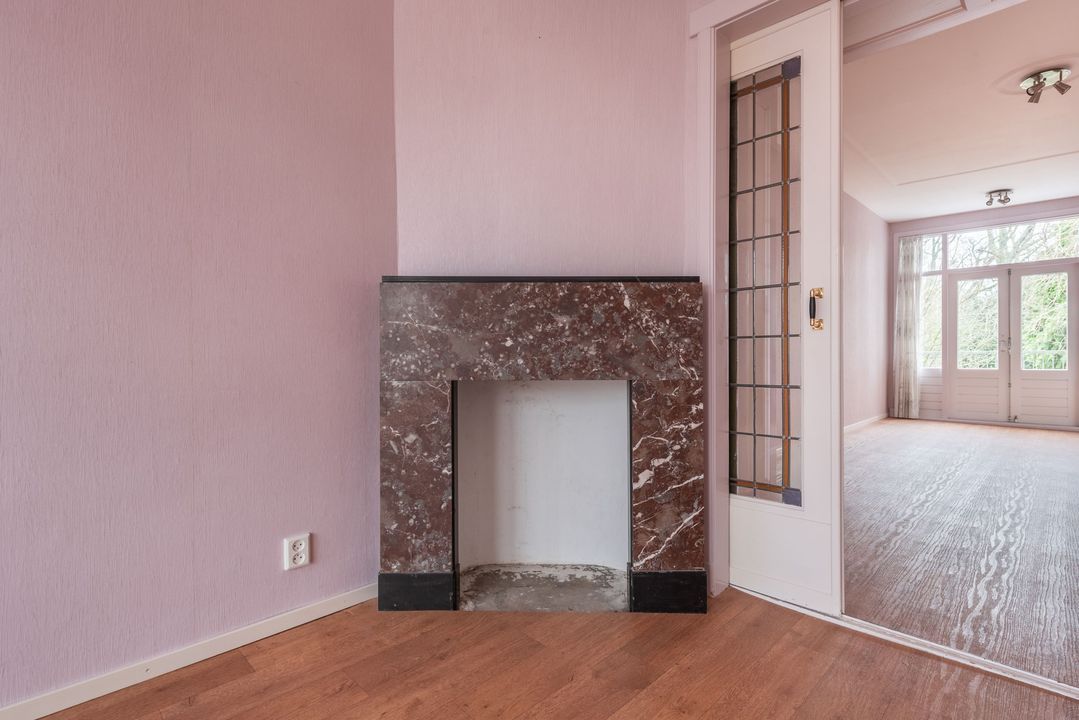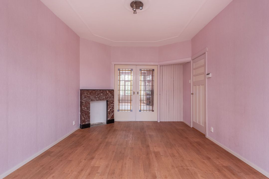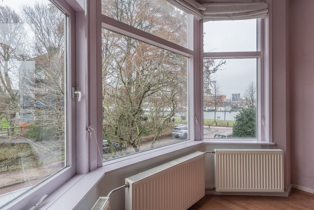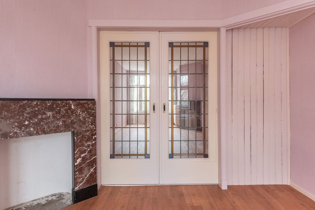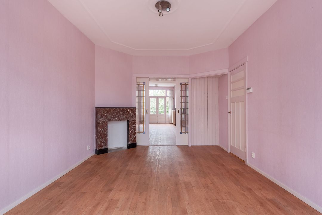 Ruime woon-/eetkamer ensuite met originele schuifseparatie en dubbele schouwen en kasten. Totale lengte ruim 12,5 meter diep en 3,5 meter breed. En een goeie hoogte van 2.80 meter. Fraaie erker met vrij uitzicht aan de voorzijde. Leuke doorkijk naar o.a. water.