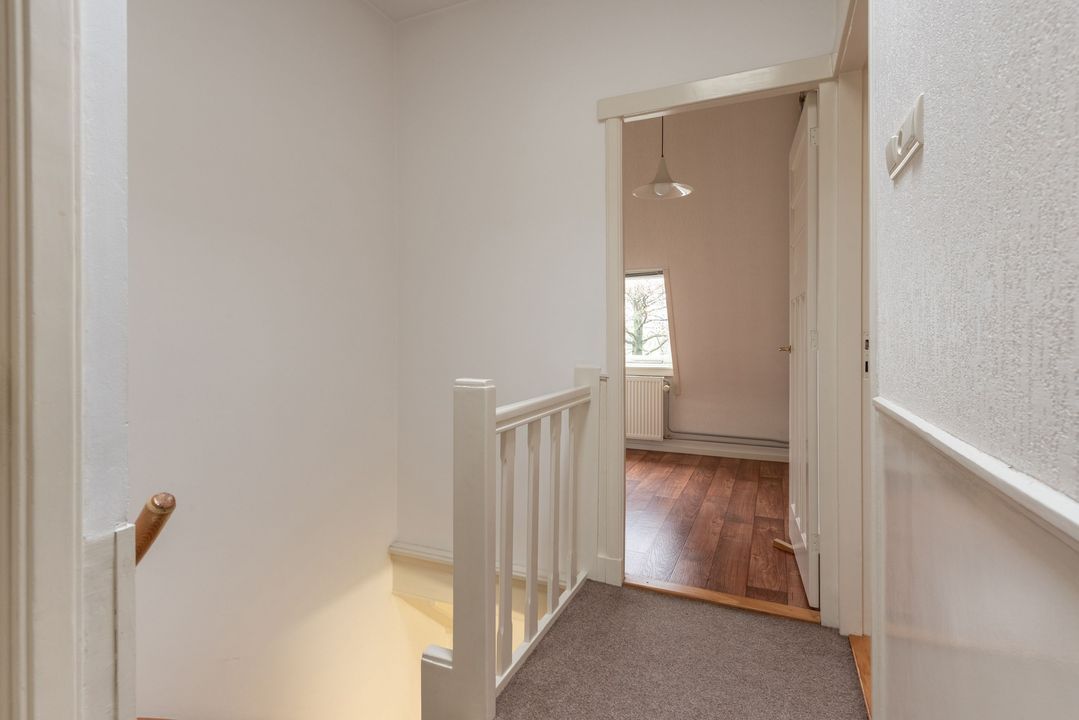 Trap naar de tweede (bovenste) verdieping alwaar L-vormige overloop, tweede toilet. Twee slaapkamers aan de voorzijde van resp. 3.71 meter bij 3,50 meter en 2,70 meter bij 2,14 meter. En aan de achterzijde 4,39 meter bij 3,50 meter.